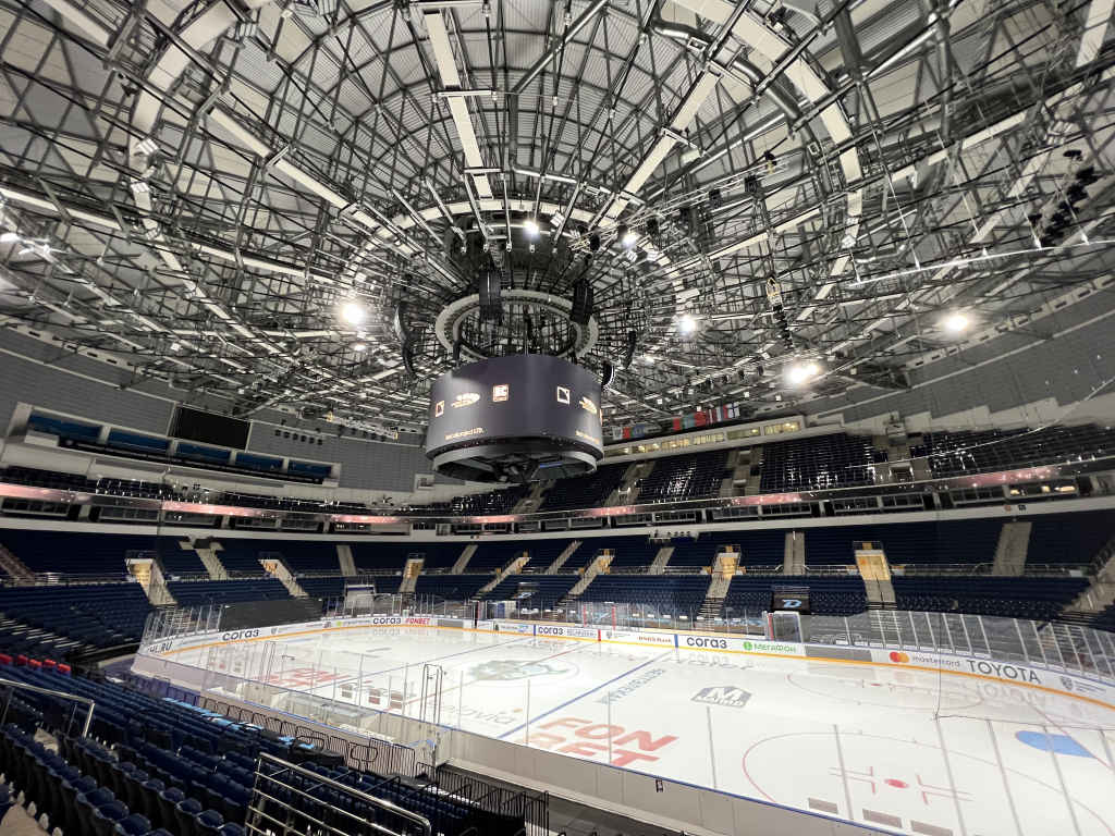 Two hangs of three A15 Focus face the opposite ends of the arena, with four A15 Wide hung in the middle facing the playing surface for ice hockey and basketball games.