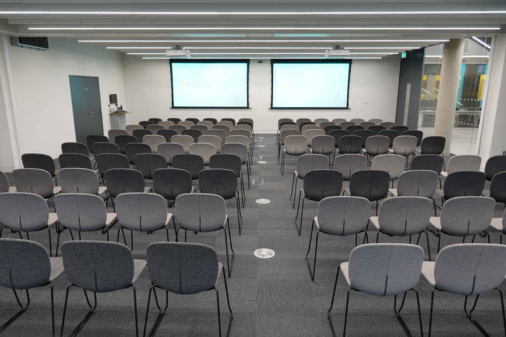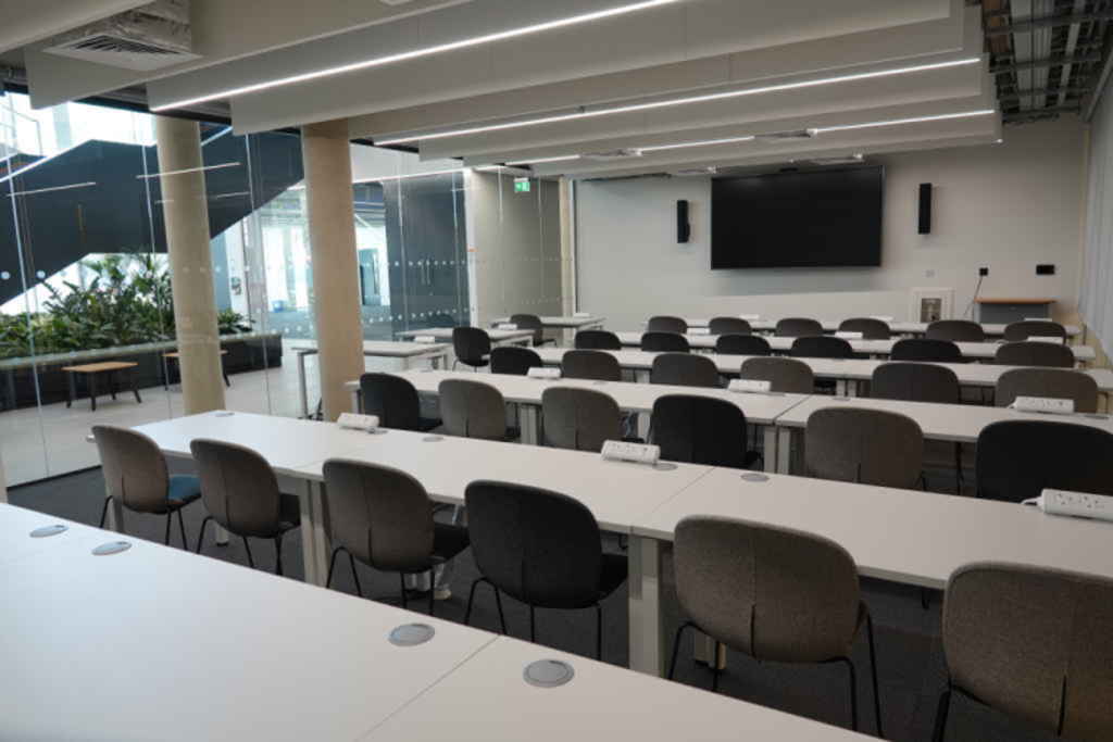 Many spaces are flexible by design. PUB1 is a flat-floor event space with two projectors, a removable partition and mobile furniture, suited to exhibitions or outreach. MR3 is a hybrid space for traditional blackboard lectures or boardroom meetings. Extensive data points allow for future upgrades or reconfigurations as needed.