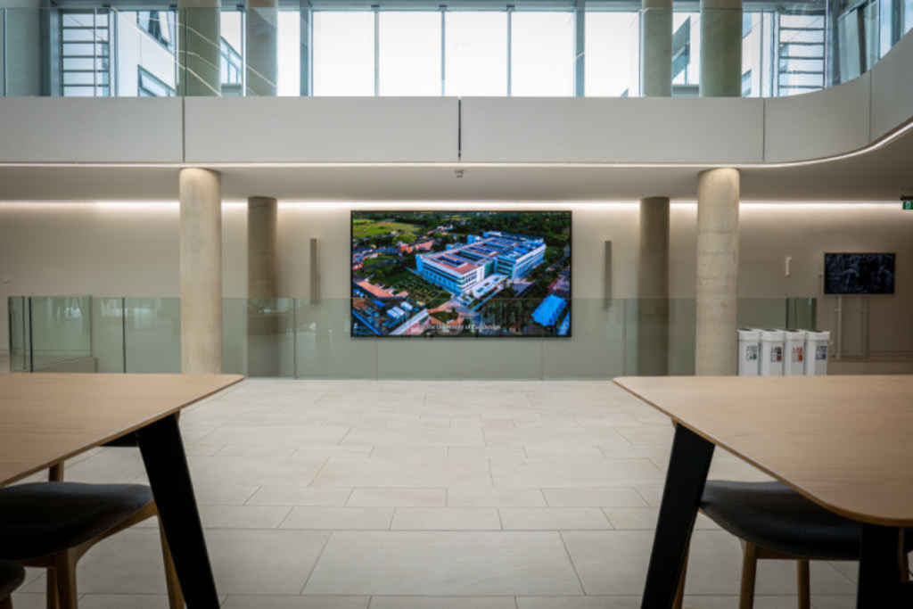 AV also supports wayfinding and communication. Digital signage includes Samsung QM 4K displays and Samsung Flip interactive kiosks. At the foyer entrance, visitors are greeted by a 164-inch LED wall flanked by Q-SYS column speakers, capable of displaying video content and presentations with high-quality sound for public-facing displays.