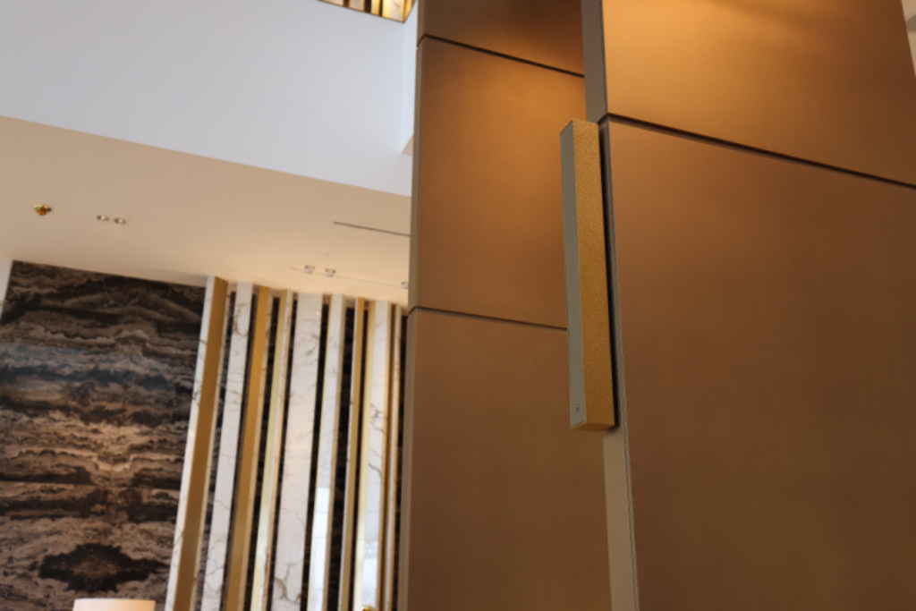 Walking into the vast lobby space, watching the water pour from the elevator exteriors and listening to the hustle and bustle of visitors flitting across this vast space and its lounges, it becomes clear that the sound feels discreet, almost ethereal in its delivery, surrounding guests no matter which part of the lobby they traverse through, a delicate touch was absolutely key.