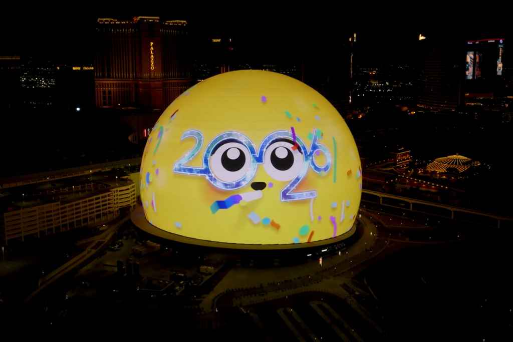 In Las Vegas, the arrival of 2026 underlined how New Year’s Eve celebrations are becoming increasingly AV-led. At the centre of the Strip’s midnight moment was Sphere, which once again served as the city’s official countdown to the new year. Custom content played across the Exosphere, the world’s largest LED display, counting down to midnight and featuring Orbi in bespoke 2026 graphics alongside a new artwork commission.