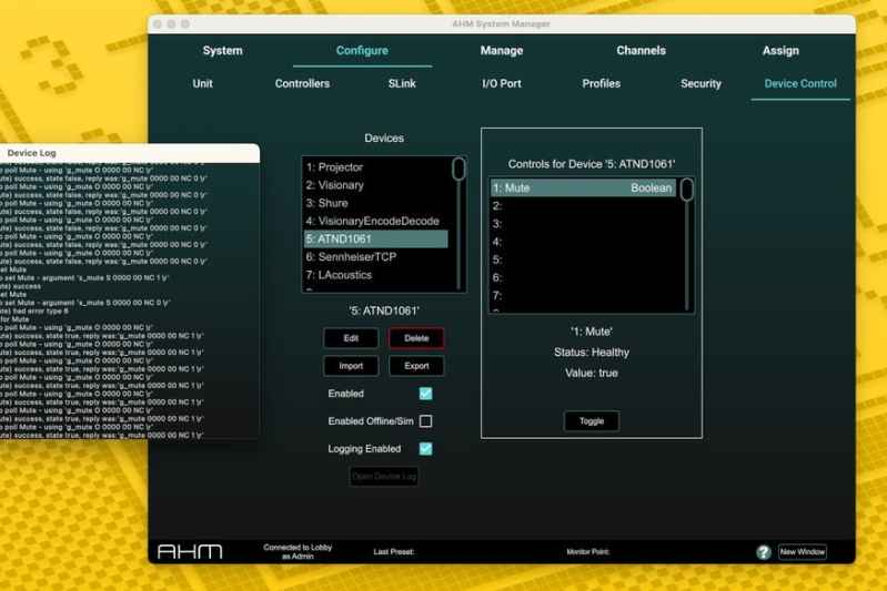 V1.6 also brings expanded third-party control and monitoring, allowing AHM to integrate tightly with devices such as displays, video switchers, microphones, and amplifiers. Device behaviour can also be monitored directly from IP controllers.