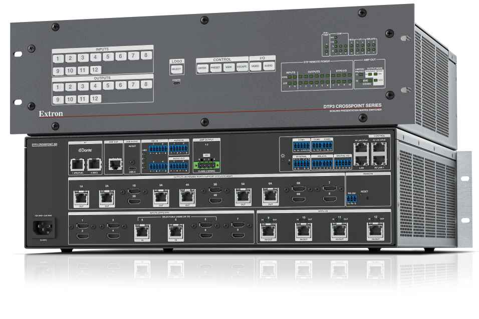 Extron has announced that the flagship model in the DTP3 CrossPoint Series of configurable presentation matrix switchers is now shipping.