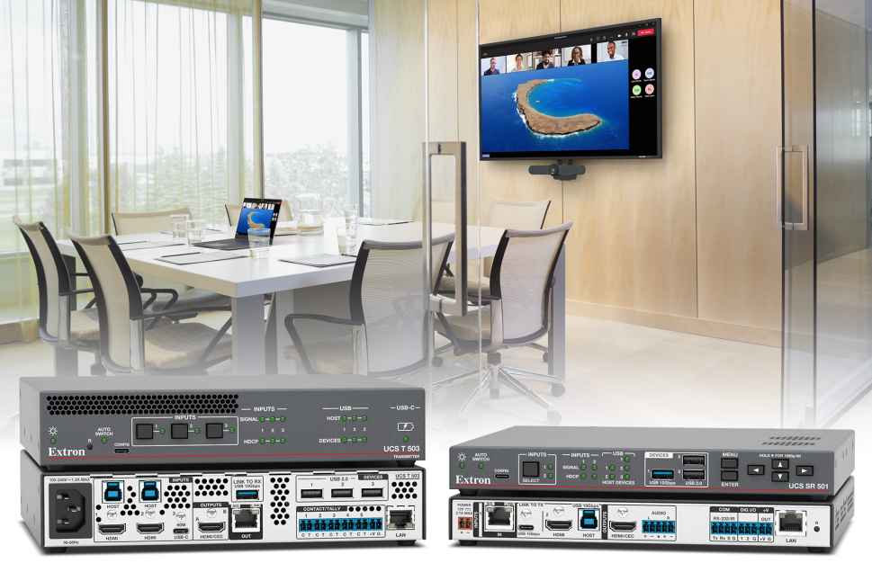 Extron has debuted its UCS 504 4K collaboration switching transmitter and scaling receiver kit, combining AV and USB switching with twisted pair signal extension.